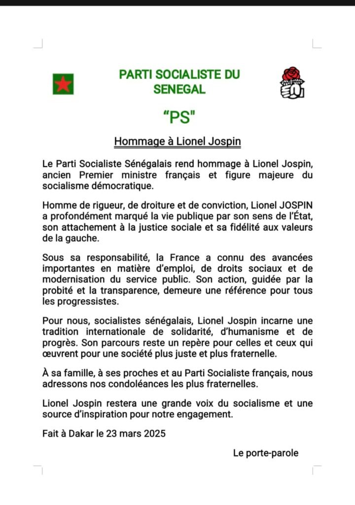 Le Parti Socialiste du Sénégal (PS) a rendu un hommage appuyé à Lionel Jospin, ancien Premier ministre français et figure emblématique du socialisme démocratique, saluant un parcours politique marqué par la rigueur, la probité et un engagement constant en faveur de la justice sociale.